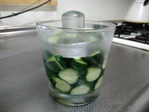 大事なのは蓋になるものが重しの役目をすることなので、材料を入れた容器のクチの大きさよりも小さいお皿を選ぶことです。写真のように、蓋であって重しの役目をしているものは容器の内側に入っていてキュウリをしっかり押さえています。