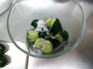 切ったキュウリ1本分を容器に入れて、そこに塩(多めの適当)を入れます。